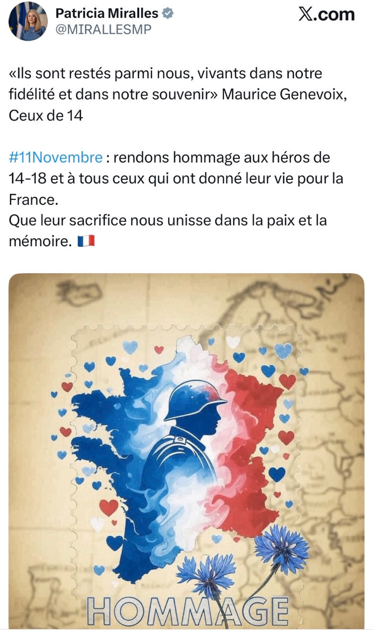 L'entretien était bien intéressant et au détour d'une phrase durant la conversation a été évoquée une bourde de Patricia Miralles, Ministre déléguée chargée de la Mémoire et des Anciens Combattants du gouvernement Bayrou. Pour rendre hommage aux combattants de la guerre de 14-18 et appuyer son propos, elle (ou son équipe) a choisi de faire appel à une IA pour illustrer son intervention sur X. Patatras ! Boulette ! L'IA en question représente une France joliment bordée de petits cœurs trop mignons et riche de deux péninsules bretonnes.