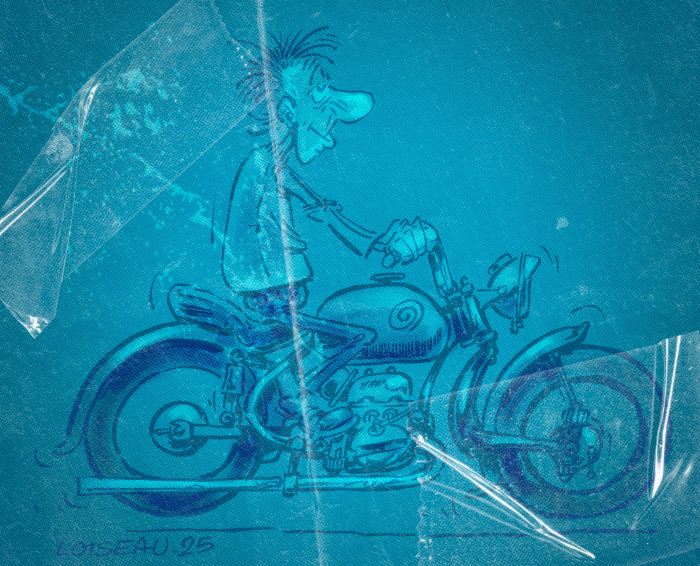 On ne peut pas me faire confiance. J'ai eu une envie de dessiner une motocyclette. C'est arrivé sans que je m'y attende. A l'improviste, à l'insu de mon plein gré. J'avais dit, et ce n'est pas vieux, que j'en avais marre de dessiner des motocyclettes insensées et j'ai replongé dans mes pires travers. Et le pire, c'est que j'y ai pris du plaisir. Ça m'a amusé. Et le pire du pire, c'est qu'il est possible qu'il y en ait encore d'autres des motocyclettes stupides.